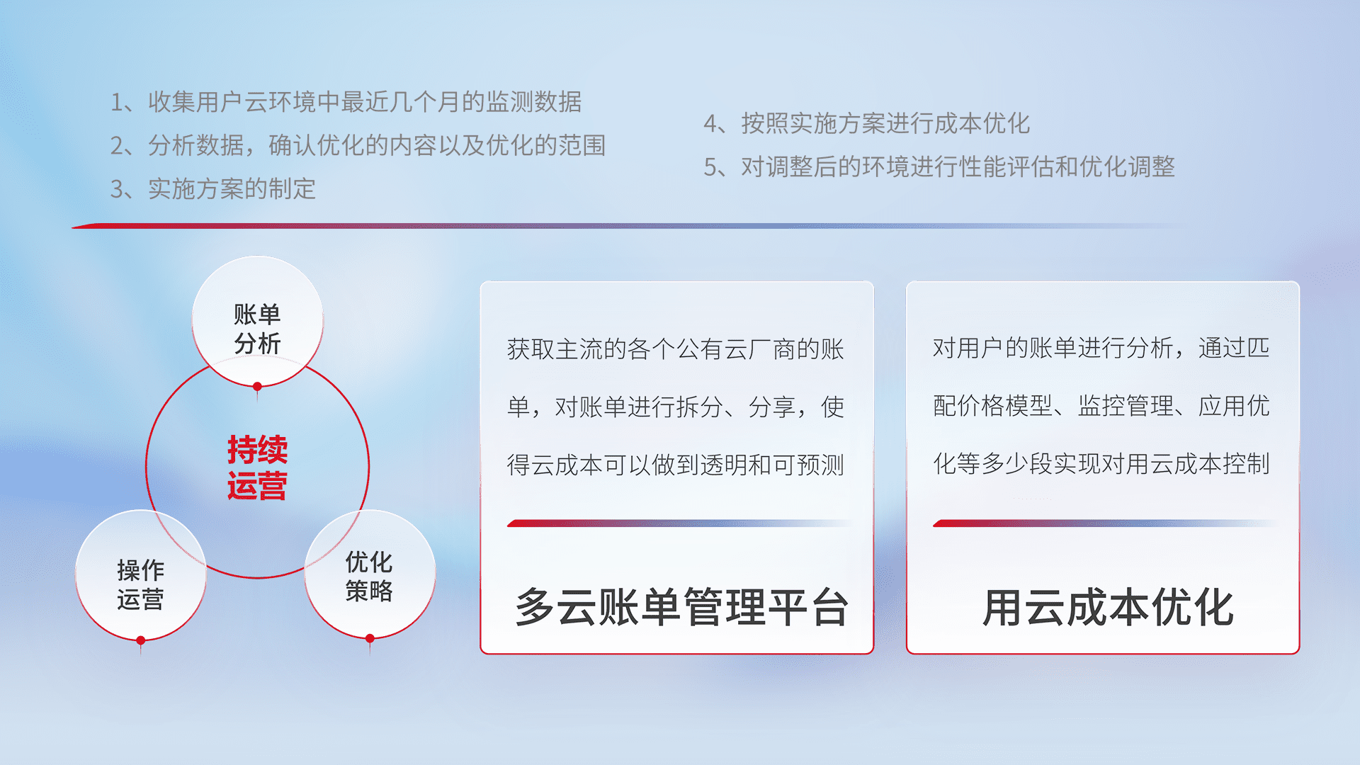 通过多云纳管,,以统一的资源数据模型把客户的云资源进行抽象和封装,,进而实现对多云资源的统一操作,,,保障云资源管理的可靠性、、、稳定性与可用性。。。量身定制化运维内容,,,,配置、、、开发运维、、、、补丁管理、、、备份、、、监控、、、、认证和访问管理、、、审计和日常巡检等,,保障在用云过程中的可靠度,,稳定度以及高可用率。。。