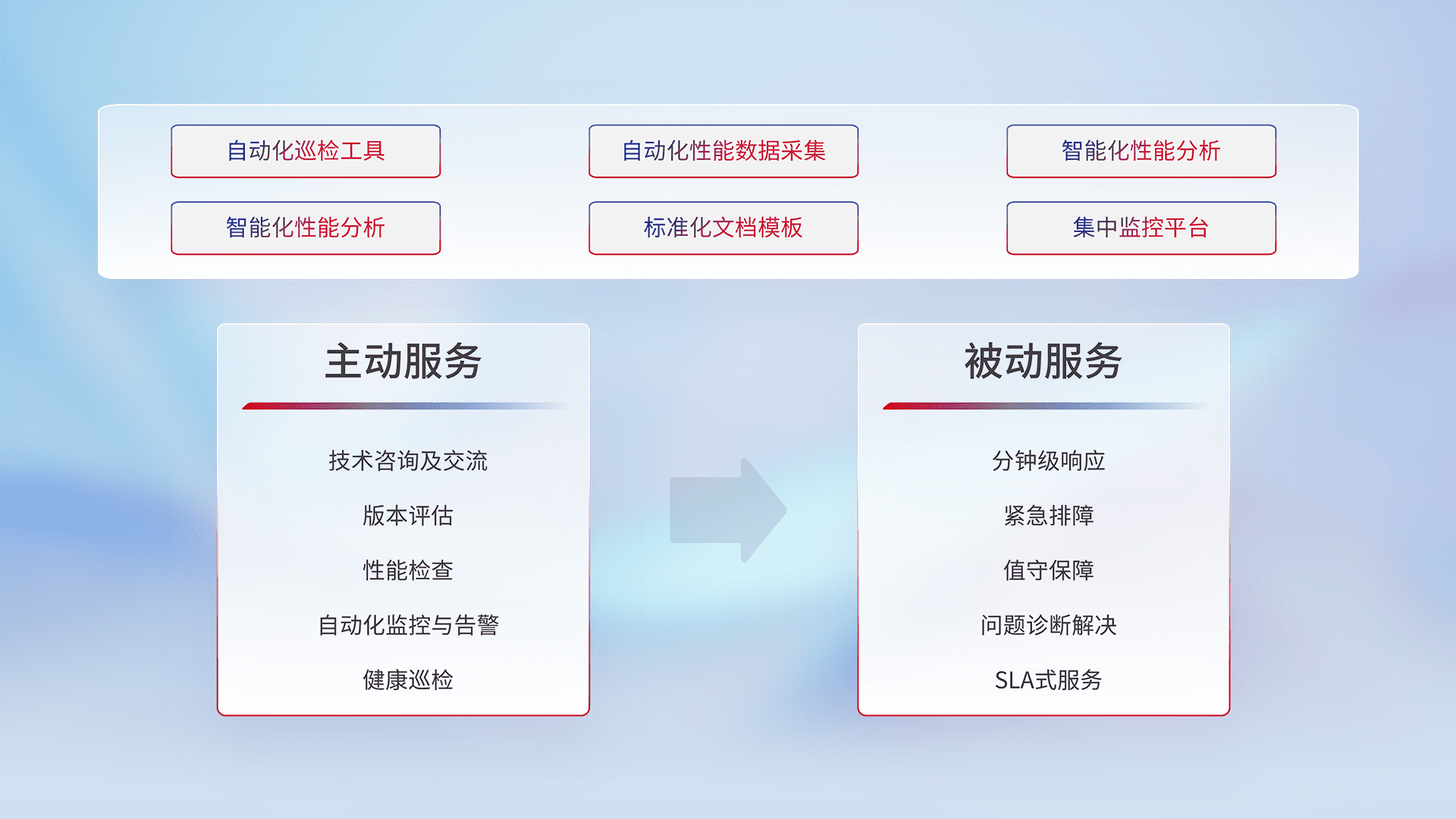 智能化工具和标准化文档,,,保障服务质量,,提供主动服务(包含技术咨询、、版本评估、、、性能检查、、自动化监控与告警、、、、健康巡检)和被动服务包含(分钟级响应、、紧急排障、、值守保障、、、问题诊断解决、、、、SLA服务)。。。